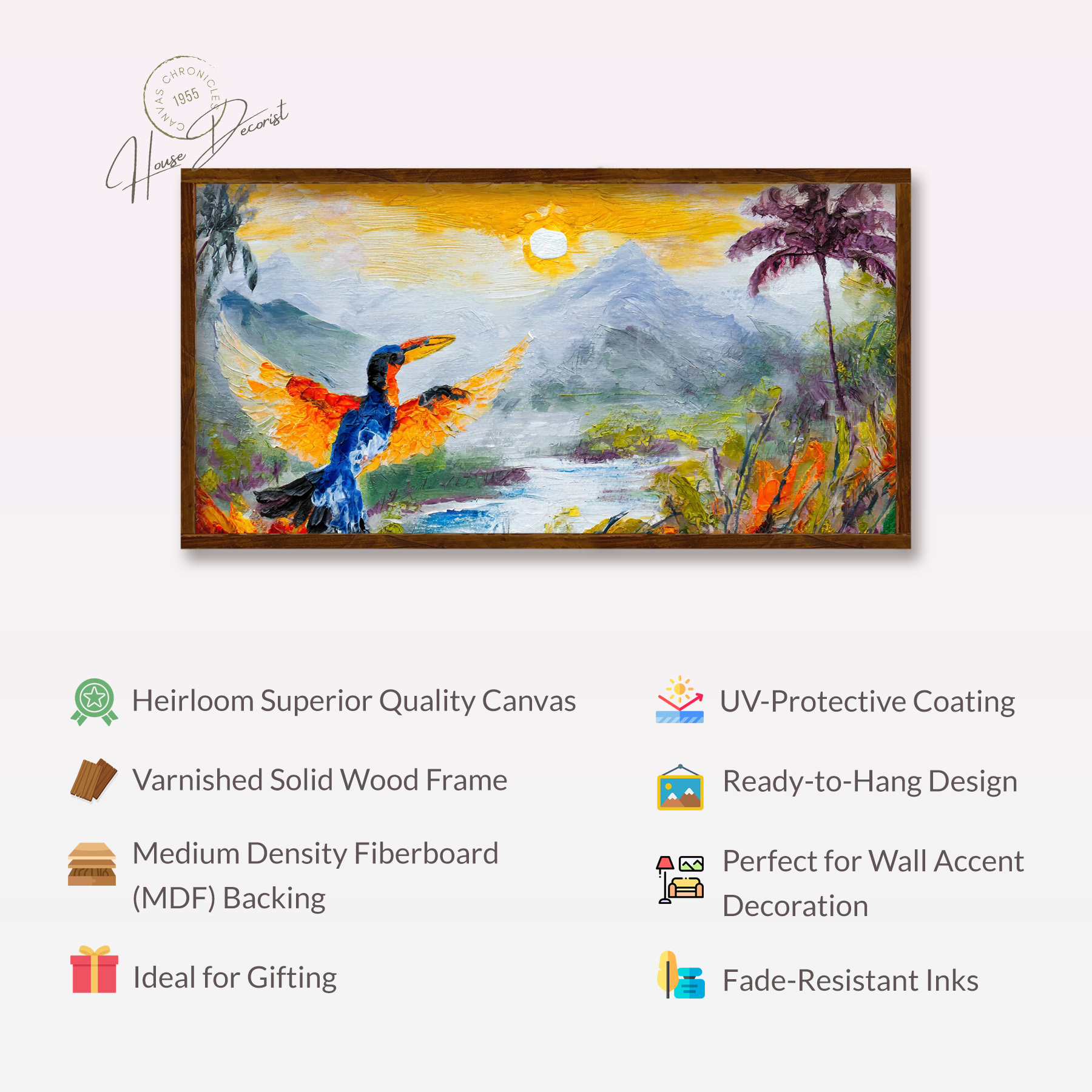 Immerse your space in timeless elegance with our canvas art. Crafted with heirloom quality, this piece features a varnished solid wood frame and meticulous craftsmanship. Ideal for gifting or wall accent decoration, it’s a versatile decor piece that blends charm and sophistication effortlessly.